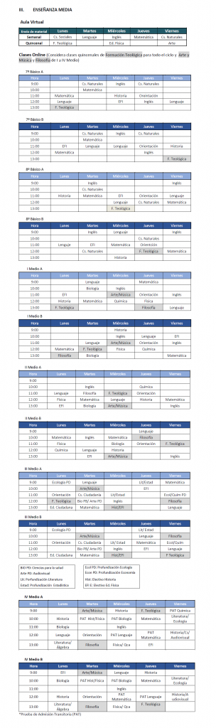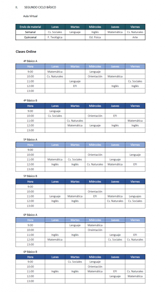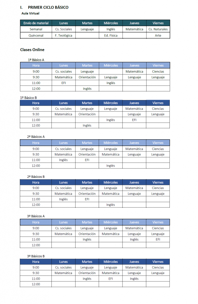 A continuación encontrarán la información de Horarios para sesiones en Aula Virtual para alumnos de Ciclo Inicial a IV Medio.
